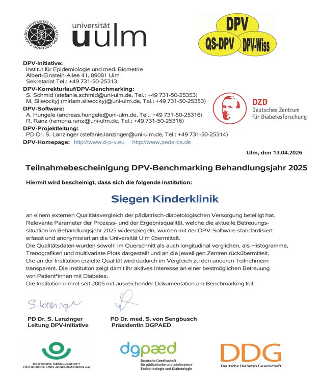 Hiermit wird bescheinigt, dass sich die folgende Institution: Siegen Kinderklinik an einem externen Qualitätsvergleich der pädiatrisch-diabetologischen Versorgung beteiligt hat.