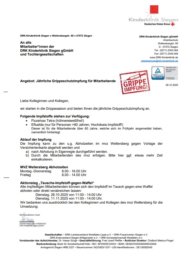 Grippeschutz-Impfung für MitarbeiterInnen!